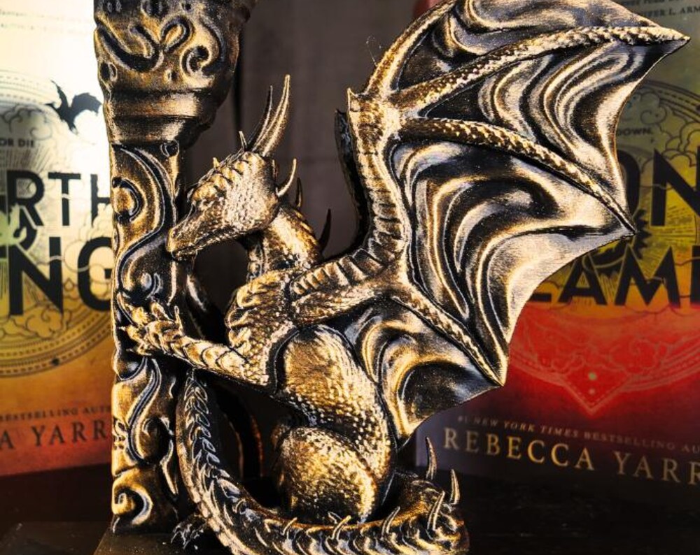 Discover the magic of dragons and the allure of The Empyrean series with these stunning 3D-printed Empyrean-themed dragon bookends. Whether you're a devoted fan of the Empyrean book series, a collector of dragon-themed décor, or simply seeking a unique addition to your bookshelf, these handcrafted bookends are the perfect choice. Available in three striking colors—Antique Gold, Black Silk, and Gold Silk—these bookends are both stylish and functional. The Antique Gold finish is hand-painted by me, adding an extra layer of craftsmanship and uniqueness to each piece. 🐉✨